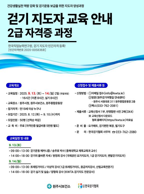9월 10일까지 만 19세 이상 원주시민 50명을 선착순 모집한다. (사)한국걷기협회에 방문해 신청하거나 이메일또는 팩스로 접수할 수 있다.