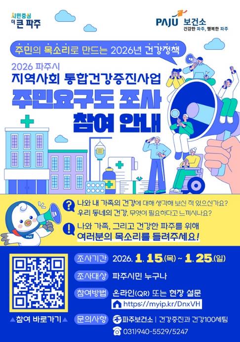 이한상 파주보건소장은 “이번 주민건강요구도 조사는 시민이 직접 건강정책의 방향을 제안하는 과정”이라며, “시민 여러분의 소중한 의견을 바탕으로 지역 특성과 수요에 맞는 건강증진사업을 추진해 나가겠다”라고 말했다.