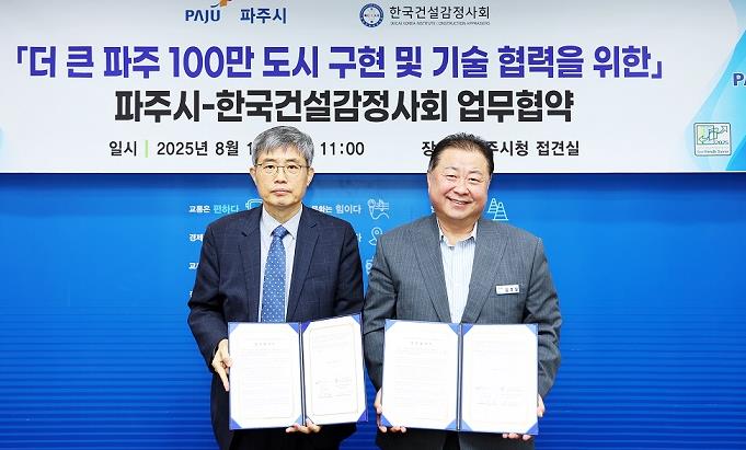 파주시는 지난 13일 시청 접견실에서 김경일 파주시장과 김창근 한국건설감정사회장이 참석한 가운데 ‘더 큰 파주, 100만 도시 구현 및 현안 사업 기술협력’을 위한 업무 협약을 체결했다.