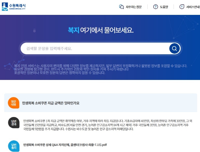 현재 44개동 행정복지센터 등 민생회복 소비쿠폰 관련 부서에서 ‘수원시 AI 복지 민원서비스’를 사용 중이다.