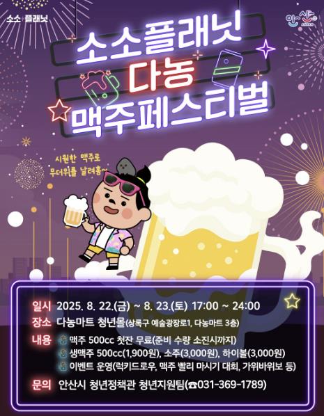 이번 맥주 페스티벌은 소소플래닛 다농 청년상인들이 지역 주민과의 상생협력을 위해 마련한 고객 감사 행사로 시민들에게 저렴한 먹거리와 열린 쉼터 공간 등을 제공한다.