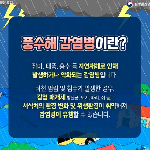 풍수해 감염병에는 오염된 물이나 음식 섭취로 인한 수인성·식품매개 감염병(장관감염증, A형간염, 세균성 이질, 장티푸스 등), 물웅덩이 등 모기 증식이 쉬운 환경으로 인한 모기매개 감염병(말라리아, 일본뇌염), 오염된 물 등에 직접 노출로 인한 접촉성 피부염, 렙토스피라증, 안과 감염병 등이 있다.