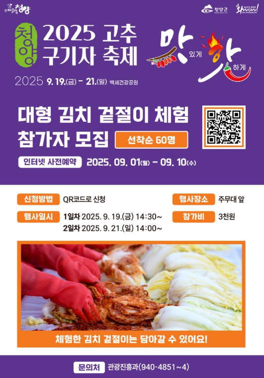 회차별 100명이 참여할 수 있으며, 청양산 고춧가루로 만든 양념과 신선한 배추가 제공되어 현장에서 직접 김치를 버무려 담아갈 수 있다.