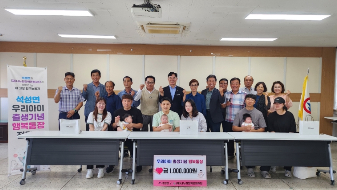 이길종 석성면장은 “올해 3가정에서 예쁜 아기 3명이 태어나 석성면에 소중한 울림을 더해 주어 고맙다.”라며 “행복통장 전달식은 단순한 지원을 넘어, 아이와 가족에게 보내는 ‘따뜻한 응원’이자 ‘행복의 씨앗’”이라고 밝혔다.