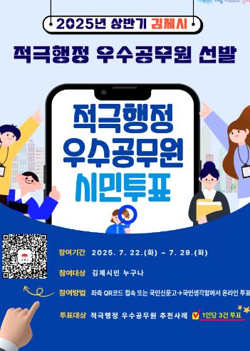 이번 시민투표는 행정의 최종 수혜자인 시민이 직접 우수사례를 선택함으로써, 김제시 전반에 적극행정을 확산시키고 공무원의 창의적이고 능동적인 업무수행을 장려하기 위해 마련됐다.
