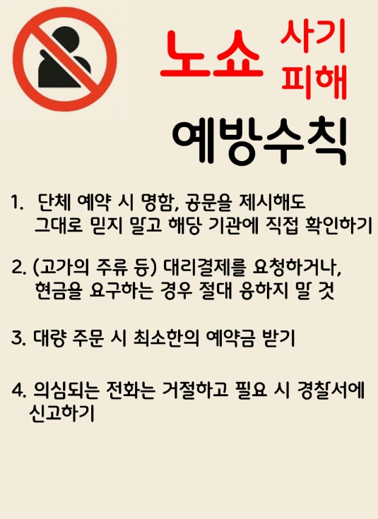 ‘노쇼(No-show) 사기’는 관공서, 군부대, 연예인 매니저 등을 사칭해 단체 예약이나 숙박·음식 주문을 한 뒤 실제로는 방문하지 않거나, 대리 결제를 핑계로 현금을 요구하는 수법이다.