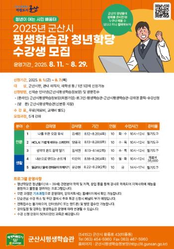 수강 신청은 8월 1일 오전 9시부터 8월 7일 오후 6시까지 군산시평생학습정보망에서 신청하거나 군산시평생학습관으로 방문 접수하면 된다.