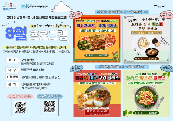 프로그램은 남해읍 화전로 78번가길 25-10에 위치한 창생플랫폼 공유주방에서 진행되며, 재료비는 참가자 자부담이다.