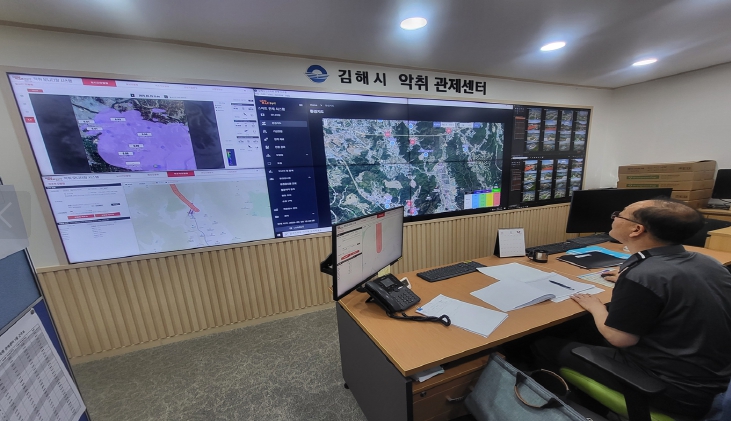 김해시 악취통합관제센터는 2023년 7월 시청 내 구축한 시설로 IoT(사물인터넷) 기반의 스마트악취측정기 46대를 주요 발생원과 영향 지역에 설치해 복합악취를 자동 측정하고 있다.