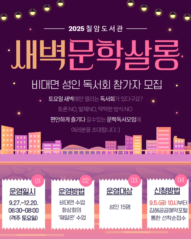 ‘새벽문학살롱’은 오는 9월 27일 새벽 6시 30분 비대면 화상회의로 첫 모임을 시작하며, 12월 20일까지 격주 토요일 아침 총 7회 진행된다.