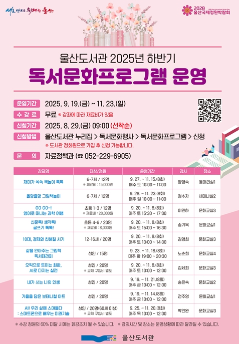 8월 29일 오전 9시부터 울산도서관 누리집을 통해 선착순 모집하며, 도서관 정회원만 신청 가능하다.