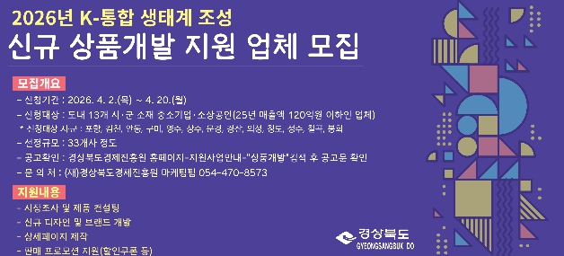 한편, 경북도는 시군 공동(총 15개 시군 참여)으로 K-통합 마케팅 생태계 조성사업을 신설해 이번 신규 상품개발 사업 외에도 ▲맞춤형 마케팅 패키지(온라인 광고, 콘텐츠 제작 등) ▲오프라인 특판전 지원사업을 추진하여, 지역 기업의 판로 역량을 한층 더 끌어올릴 계획이다.