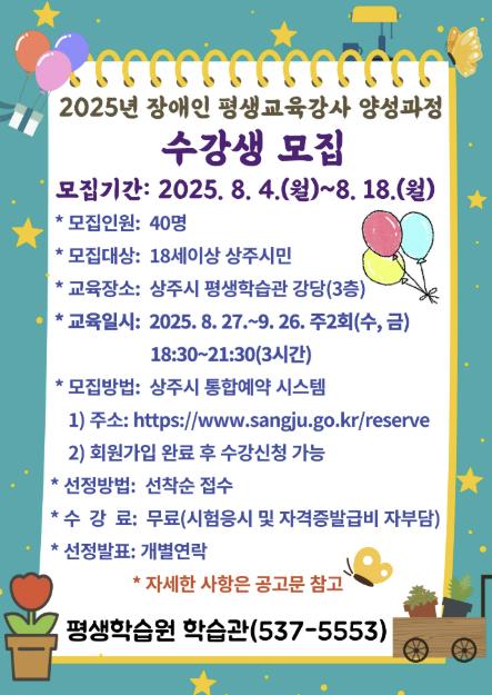 권양희 평생학습원장은 “상주시는 지난 몇 년간 다양한 장애인 평생교육 과정을 운영하며 장애인 평생학습도시로써의 기반을 다져왔으며 특히 소외계층의 교육 접근성을 높이는데 주력하고 있다. 이번 과정을 통해 장애인의 학습권을 보장할 수 있는 전문인력 양성으로 향후 장애인 맞춤형 교육과정도 확대해 나갈 계획”이라고 말했다.