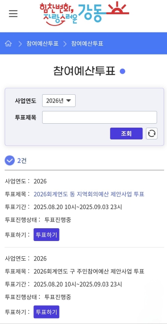 최준식 기획예산과장은 “주민참여예산은 구민의 선택으로 지역의 미래를 함께 만들어가는 제도인 만큼, 더 많은 주민들이 투표에 참여해 주실수록 의미 있는 결과가 나온다”라며, “구민 여러분의 소중한 한 표 한 표가 내년 예산에 반영되는 만큼 적극적인 참여를 부탁드린다”라고 말했다.