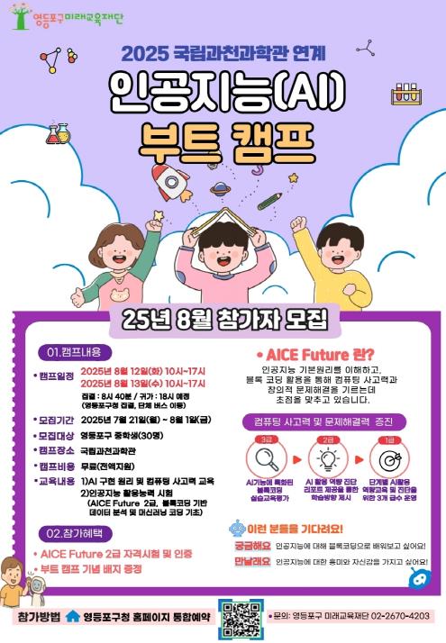 영등포구 미래교육재단 관계자는 “인공지능과 코딩 분야에 관심 있는 학생들이 실습 중심의 체험을 통해 디지털 역량을 키우는 좋은 기회가 되길 바란다”라며 “국립과천과학관이 제공하는 전문 교육과정과 함께하는 만큼 학생들의 많은 관심과 참여를 기대한다”라고 전했다.