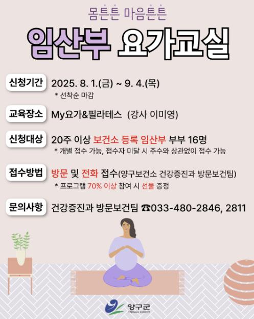 요가 교실은 전문 강사가 진행하며 ▲올바른 호흡과 명상 ▲기혈순환과 부종 예방 ▲척추·골반 강화 ▲전신 유연성 향상 등 임신기에 적합한 다양한 요가 동작으로 구성된다.