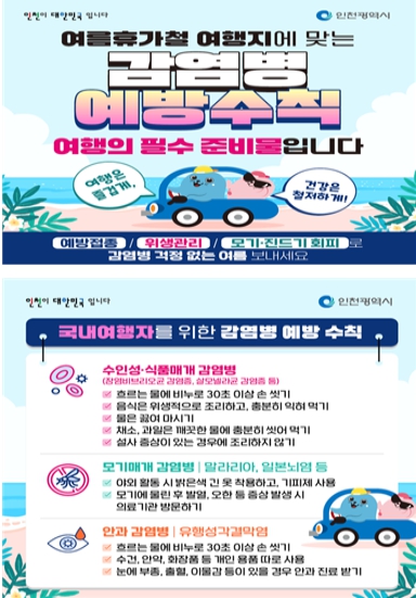 여름철은 고온다습한 환경으로 인해 각종 감염병이 유행하기 쉬운 시기다. 특히 여행지에서는 위생관리가 소홀해질 수 있어 감염에 노출될 가능성이 높다. 이에 인천시는 수인성·식품매개 감염병, 모기 매개 감염병, 안과 감염병 등을 중심으로 시민들에게 예방수칙을 안내하고 있다.