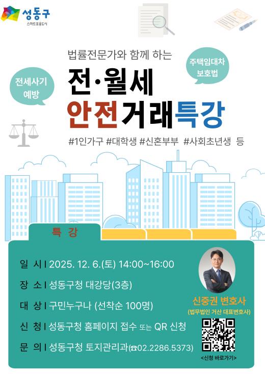 정원오 성동구청장은 “이번 특강을 통해 부동산 거래 시 실질적이고 현실적으로 도움이 될 수 있는 정보를 얻는 좋은 기회가 될 것”이라며, “앞으로도 부동산을 안심하고 안전하게 거래하고, 주거생활을 안정적으로 이어갈 수 있도록 힘쓰겠다”고 말했다.