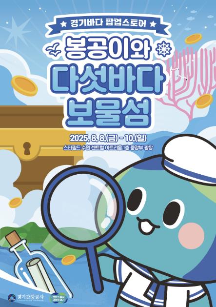 먼저, 경기바다의 다채로운 여름 매력을 선보이는 차원에서 8일부터 10일까지는 스타필드 수원 1층 센트럴 아트리움에서 체험형 팝업스토어 ‘봉공이와 다섯바다 보물섬’을 운영할 예정이다.
