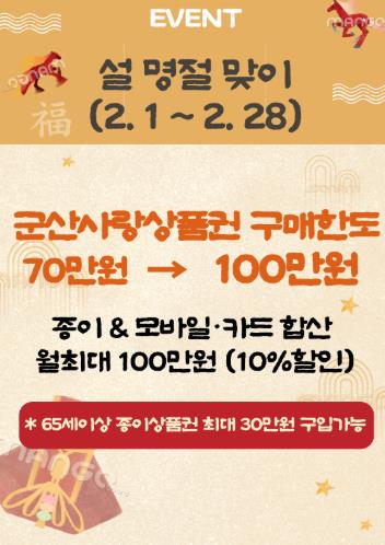 이헌현 군산시 일자리경제과 과장은 “설 명절을 맞아 추진하는 이번 구매 한도 상향이 시민들의 경제적 부담을 경감시키고, 소상공인들에게는 매출 증대의 기회가 되어 지역 경제 선순환의 마중물이 되길 바란다.”라고 밝혔다.