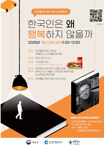 유준호 인천시 정책기획관은 “이번 특강이 인천 시민들의 행복과 정신 건강 증진에 도움이 되기를 기대한다”며 “앞으로도 인천통일플러스센터를 통해 시민들과 더 가까이 소통하고 공감할 수 있는 다양한 프로그램을 이어갈 것”이라고 말했다.
