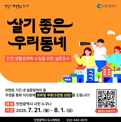 강유정 도시계획과장은 “이번 설문조사를 통해 시민이 체감하는 생활환경의 현황과 수요를 직접 반영함으로써, 보다 실효성 있는 생활권 단위 도시계획을 수립하는 데 큰 기초자료가 될 것”이라며 “많은 시민의 참여가 인천의 더 나은 미래를 함께 만들어가는 밑거름이 되길 바란다”고 전했다.