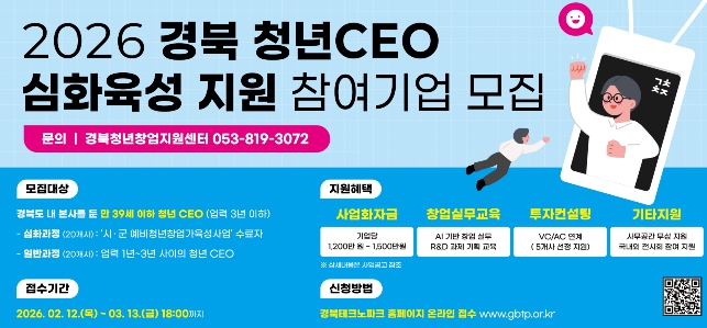이상수 경상북도 지방시대정책국장은“청년 CEO 심화육성 사업을 통해 청년 창업기업의 역량 강화를 지원해 왔다”며 “앞으로도 청년기업이 변화하는 산업 환경에 대응하며 안정적으로 성장할 수 있도록 지원을 이어가겠다”고 말했다.