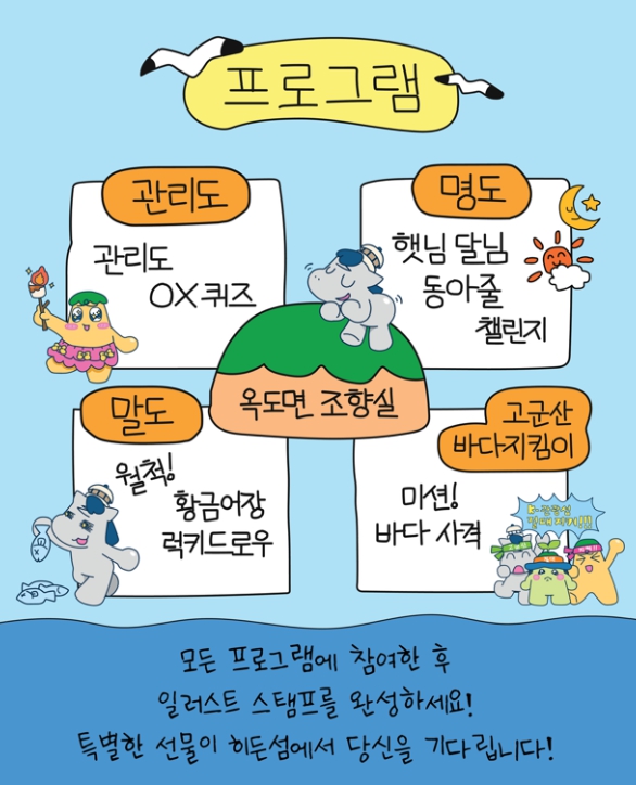 섬별 체험도 다채롭게 준비된다. 먼저 ‘백패킹’ 명소 관리도에서는 캠핑 포토존과 OX 퀴즈에 참여할 수 있다.