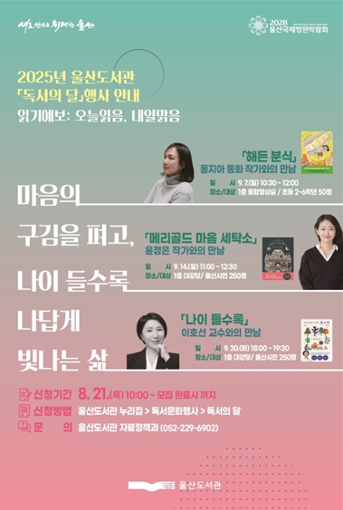 마지막으로 '나이 들수록'이호선 교수와의 만남은 오는 9월 30일 오후 6시 울산시민 250명을 대상으로 도서관 1층 대강당에서 진행된다. 삶의 기쁨과 자기돌봄의 기술을 주제로, 개인의 감정을 돌보고 심리적 회복력을 높이는 방법을 소개한다.