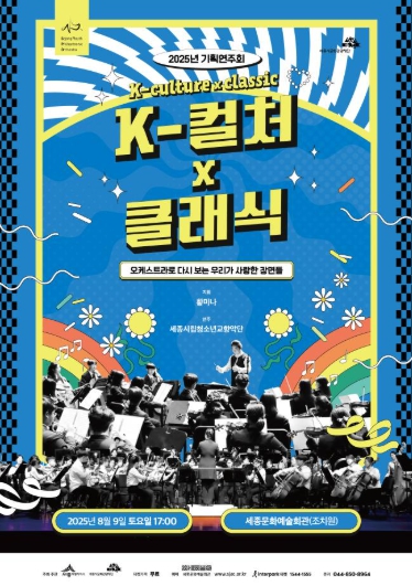 'K-culture x classic' 8월 9일 개최…7월 24일 오후 2시부터 예매기획연주회 포스터[시티트리뷴] 세종시립청소년교향악단(단장 최민호)이 내달 9일 오후 5시 세종문화예술회관에서 기획연주회 ‘케이-컬쳐x클래식(K-culture x classic)’ 공연을 선보인다.