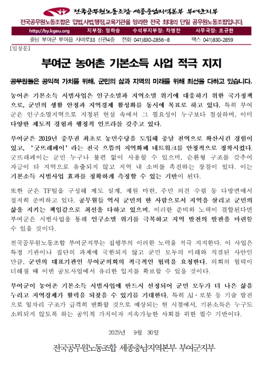공무원노조 부여군지부는 의견문에서 “부여군 공무원들은 공익적 가치를 위해, 그리고 군민의 삶과 지역의 미래를 위해서 최선을 다하고 있다.”라며, “이번 사업은 특정 기관이나 집단의 과제가 아니라 군민 모두의 미래와 직결된 사안인 만큼, 군민 여러분의 지지와 부여군의회의 협력을 요청한다.”라고 강조했다.