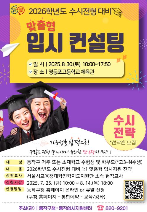 박일하 동작구청장은 “수시전형은 학생 개개인의 특성과 역량을 잘 드러내는 것이 핵심인 만큼, 전문가의 맞춤형 코칭이 큰 도움이 될 것”이라며 “앞으로도 관내 학생들이 입시정보에서 소외되는 일이 없도록 촘촘한 진학 지원 체계를 이어가겠다”고 말했다.