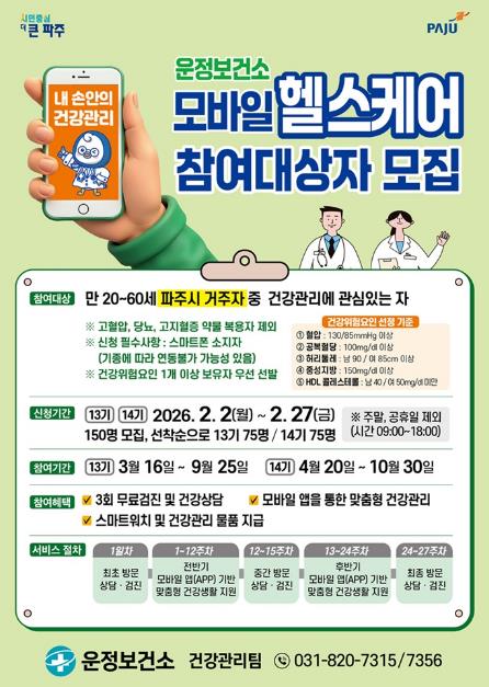 운정보건소 관계자는 “언제 어디서나 건강관리를 받을 수 있는 환경을 조성해 시민들이 스스로 건강한 생활습관을 형성하고 만성질환을 예방할 수 있도록 지원하겠다”라고 말했다.