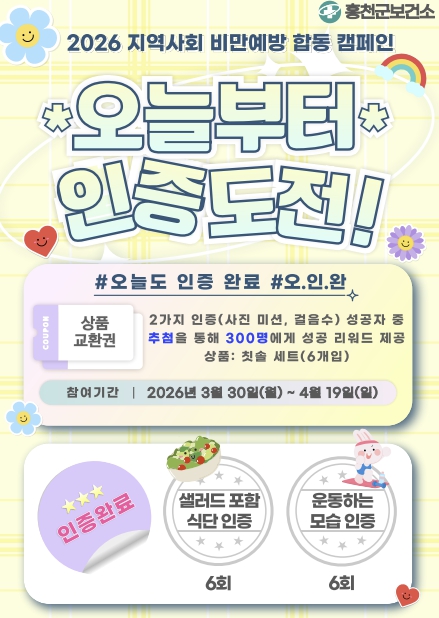원은숙 홍천군보건소장은 “비만 예방은 일상 속 작은 습관의 변화에서 시작된다”라며 “매일의 꾸준한 인증을 통해 군민 스스로 건강한 생활 습관을 형성하는 계기가 되길 바라며, 작년보다 혜택 대상을 대폭 확대한 만큼 많은 관심과 참여를 부탁드린다”라고 말했다.