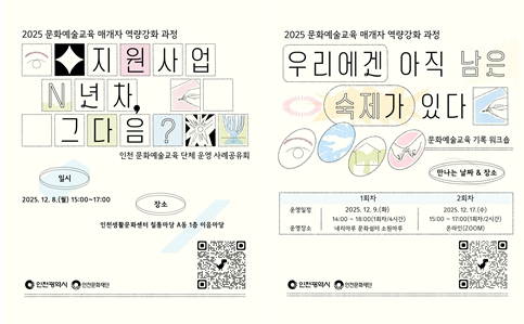 본 과정은 11월 25일부터 12월 5일까지 온라인 선착순으로 참가자를 모집하며, 2025년 인천문화재단 공모사업 선정 매개자는 우선적으로 참여 기회를 제공한다.