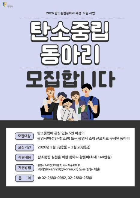 신청 대상은 탄소중립 활동에 관심 있는 광명시민(성인·청소년) 또는 광명시 소재 근로자 5인 이상으로 구성된 동아리다. 청소년 동아리는 활동을 지도할 성인 1명이 포함되어야 한다.