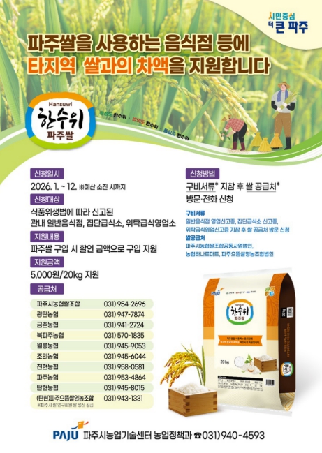 지원 대상은 '식품위생법'에 따라 신고된 관내 일반음식점, 집단급식소, 위탁급식영업소다. 파주시 지정 공급처(지역농협 하나로마트 등)를 통해 파주쌀을 구매할 경우 할인 혜택을 받을 수 있으며, 지원용 쌀은 음식점 전용 포장으로 별도 제작·공급된다. 자세한 사항은 파주시농업기술센터 농업정책과로 문의하면 된다.