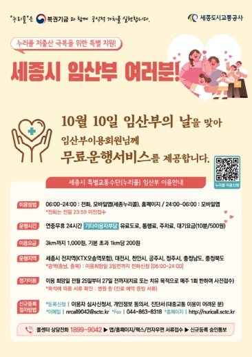 이용대상자는 세종시 누리콜에 등록된 임산부로 탑승시간 기준으로 10일 0시부터 자정까지 24시간 동안 누리콜 차량을 무료로 이용할 수 있다. 다만, 충,남북 지역 광역이동 운행은 무료 지원에서 제외된다.