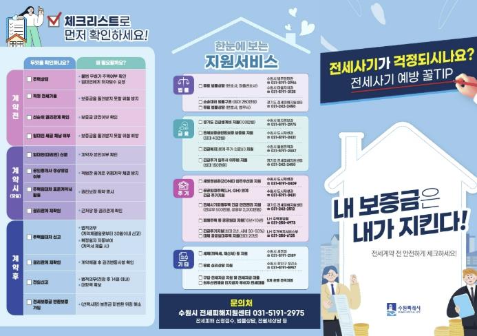 수원시가 전세사기를 예방 방법과 전세사기 피해 지원사업을 알기 쉽게 정리한 ‘전세사기 피해 예방 리플릿’을 제작해 시·구청, 동행지복지센터 등에 배포했다.