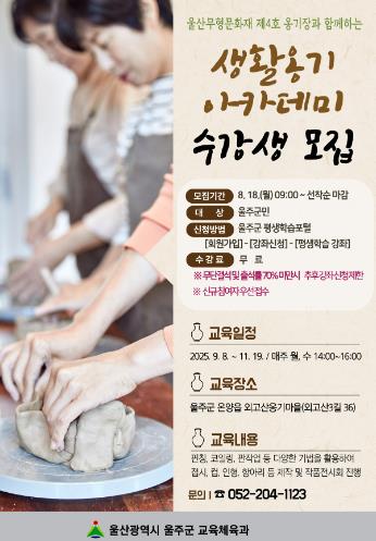 교육은 다음달 8일부터 오는 11월 19일까지 매주 월·수요일 오후 2~4시 울주군 온양읍 외고산옹기마을(외고산3길 36)에서 울주군민 15명을 대상으로 진행된다.