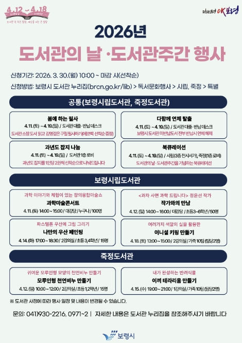 도서관의 날은 매년 4월 12일로 도서관에 대한 국민의 이해와 관심을 높이고 이용을 촉진하기 위해 지정된 법정기념일이며, 도서관주간은 도서관의 날로부터 1주간이다. 보령시 도서관에서는 4월 11일(토)부터 4월 19일(일)까지 9일간 행사를 운영한다.