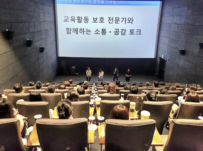 먼저 8월 7일에는 고양시 일산동구 메가박스 백석 벨라시타점에서 교육활동 침해 경험이 있거나 직무 스트레스를 겪고 있는 교원을 대상으로 ‘교사 마음을 듣다: 교육활동 침해, 감성으로 치유하고 법으로 보호하다’라는 주제의 소통·공감·힐링 프로그램을 진행했다. 이번 행사는 교원들이 최근 그 심각성이 커지고 있는 교육활동 침해 상황에 효과적으로 대응하고, 정서적으로 회복할 수 있도록 지원하기 위해 마련됐다.
