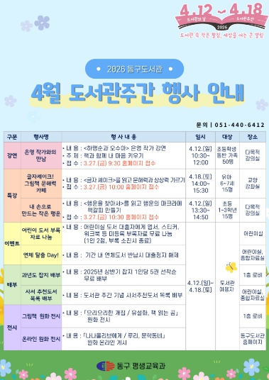 도서관 관계자는 “도서관주간을 계기로 지역 주민들이 도서관을 찾고 책과 함께하는 문화적 즐거움을 경험하는 시간이 되길 바란다”고 전했다.