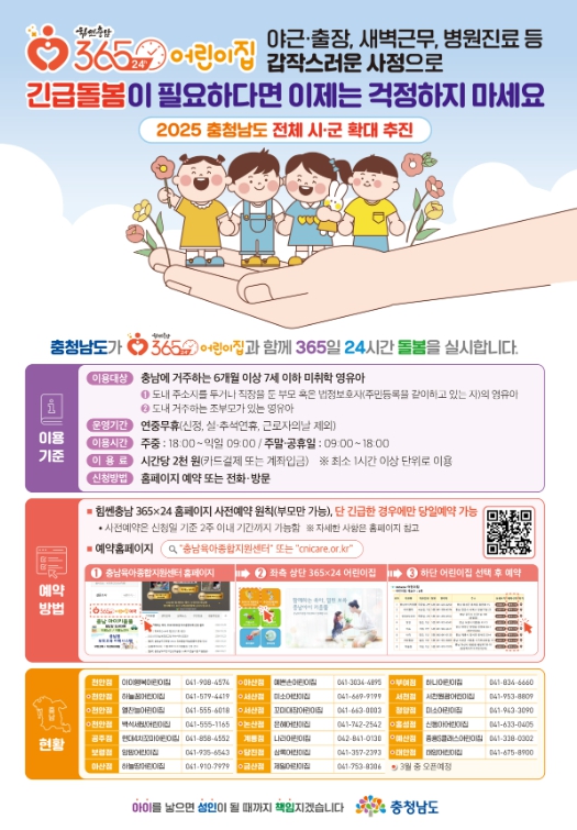 ‘힘쎈충남 365×24 어린이집’은 충남도의 ‘힘쎈충남 풀케어 돌봄 정책’ 의 일환으로, 평일 야간·새벽과 주말·공휴일에도 시간제 보육을 지원한다.