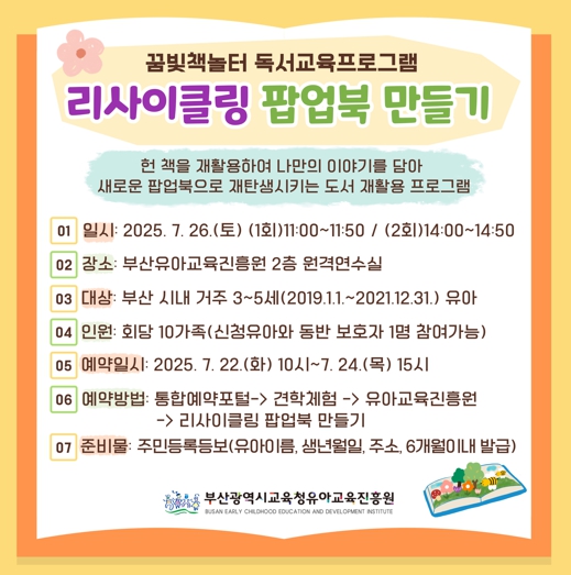 ‘리사이클링 팝업북 만들기’는 사용하지 않는 그림책을 재활용하여 나만의 창의적인 팝업북을 제작해보는 체험 활동이다. 이번 체험에서는 구조물이 세워지는 팝업 기법, 여러 겹의 종이로 쌓아 입체감을 표현하는 레이어드 팝업, 종이를 당기면 그림이 움직이는 슬라이더 팝업 등 다양한 제작 방식을 활용해 유아들의 창의력과 표현력을 끌어낼 수 있는 활동을 진행한다.