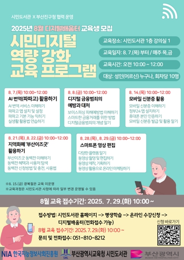 이번 프로그램은 과학기술정보통신부가 주최하고 ㈜KTCS 컨소시엄이 수행하는 ‘2025년 시민 디지털 역량 강화 교육’의 일환으로, 부산시민도서관이 ‘부산진구 디지털배움터’로 선정돼 부산시민의 디지털 정보 활용 역량을 높이기 위해 실시한다.