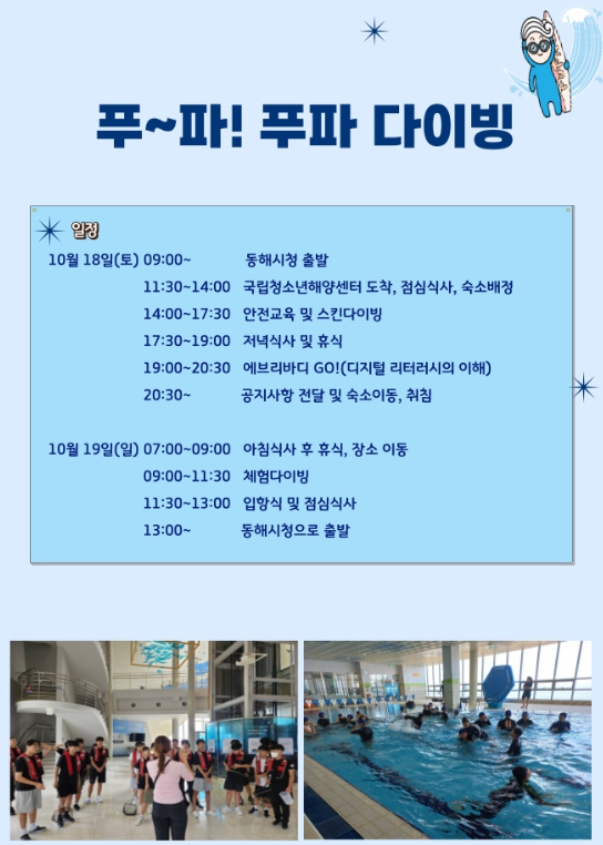 [푸~파! 푸파 다이빙]은 국립청소년해양센터와 연계하여 마스크, 슈트, 오리발 사용법을 익히는 △스킨다이빙, 수심 2.5m까지 하강하여 수중 환경을 체험해 보는 △체험다이빙, 그리고 디지털기기와 리터러시에 대한 이해와 몸으로 체험하는 디지털 협동활동인 △에브리바디 GO로 구성되어 있다.