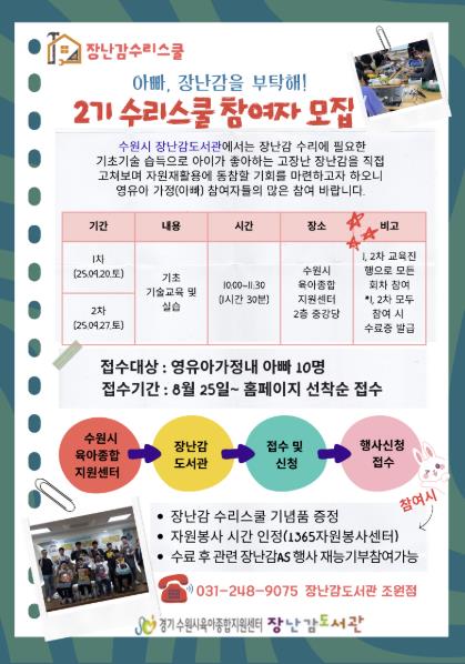 수원시육아종합지원센터 관계자는 “지난해 장난감수리스쿨이 호응을 얻어 올해 2기로 확대했다”며 “고장 난 장난감을 재활용하고, 남성의 육아 참여도를 높이는 계기가 되길 바란다”고 말했다.