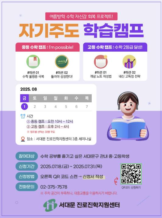 자기주도 학습캠프는 8월 1일 서대문진로진학지원센터 3층 대강의실에서 개최한다.