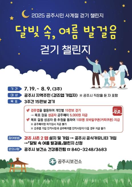 두 번째로 진행되는 ‘달빛 속 여름 발걸음’ 챌린지는 오는 7월 19일부터 8월 9일까지 3주간 진행된다. 참여자는 스마트폰 걷기 애플리케이션 ‘걷쥬 시즌2’를 활용해 총 15만 보 걷기를 목표로 하며 이를 달성한 사람에게는 지역 화폐인 ‘공주페이’가 지급된다.